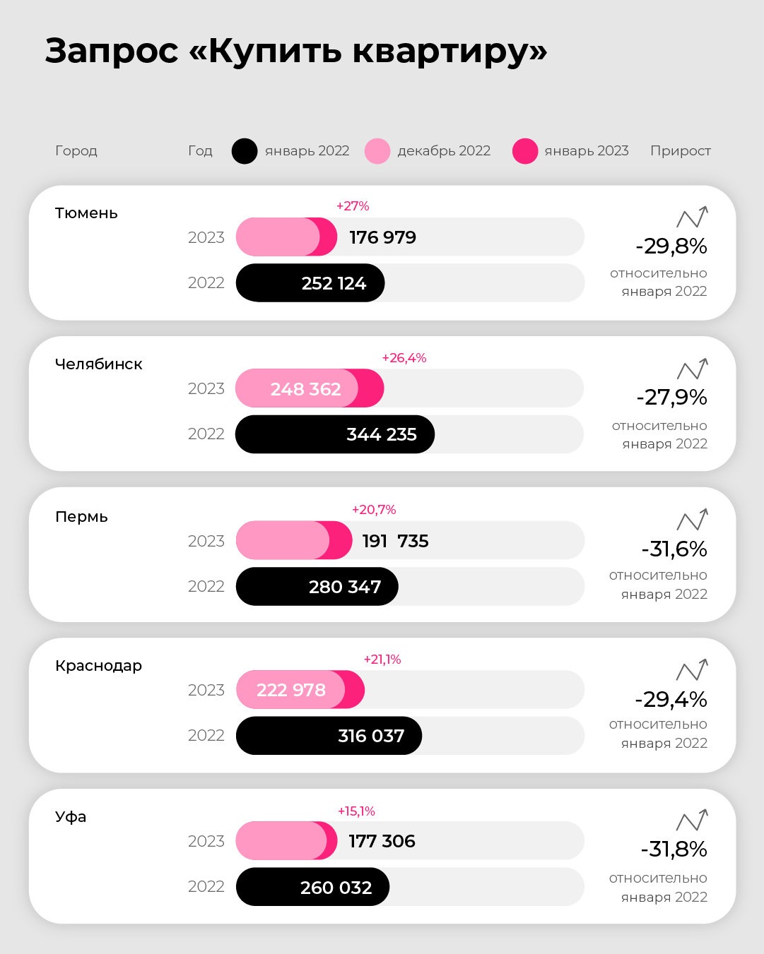В Уфе покупкой недвижимости в январе 2023 года интересуются на 31,8%меньше людей, чем в январе прошлого года. Реже вводят все запросы по теме покупки жилья. С декабря 2022 динамика положительная, как и в других регионах, общее число запросов увеличилось на +15,1%. Самый заметный рост по запросам «купить квартиру», «купить дом» и «купить дачу».