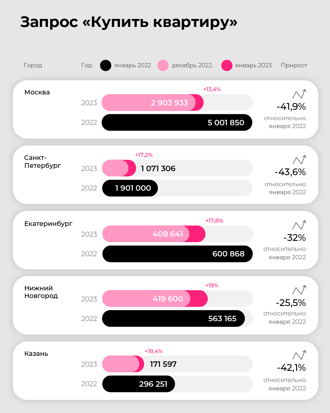 В Казани по отношению к январю прошлого года в этом январе общее количество запросов упало с 296 тысяч до 171 тысячи. Почти в два раза меньше пользователей планируют покупку квартир, домов и дач. Зато с декабря 2022 к январю спрос стал выше на 18,4%. На 44,7% больше запросов стало по ключу «купить дачу».