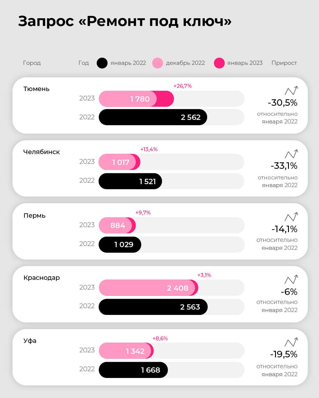 В Тюмени число запросов в этом январе уменьшилось на 30,5%. Почти в два раза меньше пользователей вводят самый высокочастотный запрос «ремонт под ключ» (-39,7%), чем в прошлом январе. За месяц спрос вырос на 26,7%. Чаще ищут ремонт под ключ.