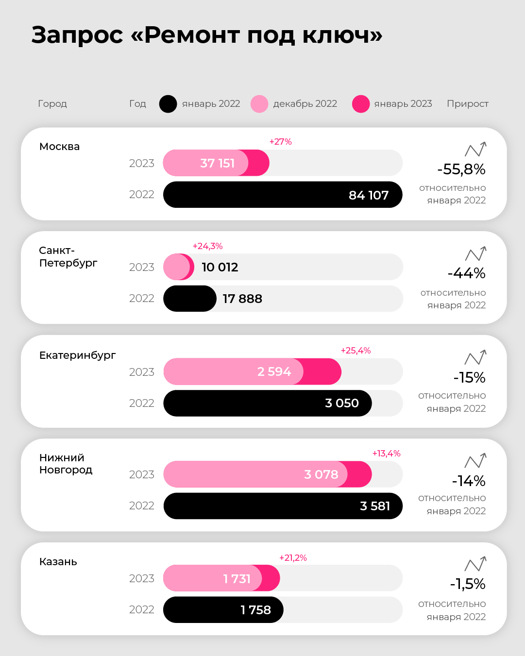 В Екатеринбурге по сравнению с прошлым январем спрос в этом году стал меньше на 15%. Меньше людей интересуются ремонтом и отделкой под ключ. С декабря общее количество запросов увеличилось на 25,4%. Есть рост по всем отдельным запросам.