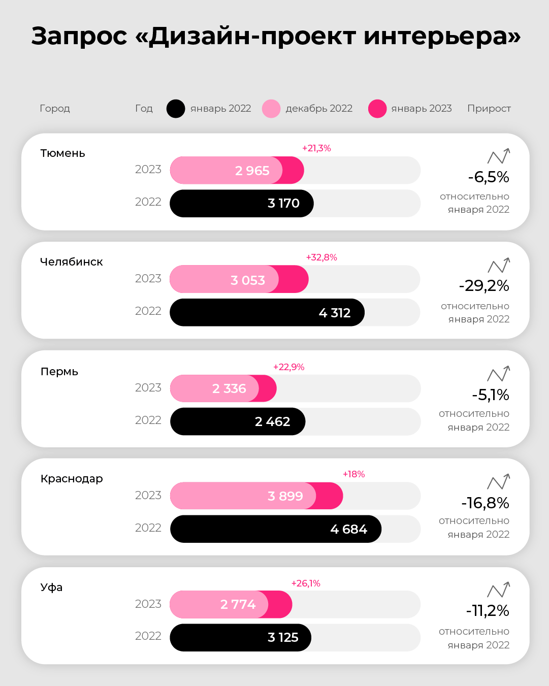 В Челябинске по отношению к январю предыдущего года спрос сократился на 29,2%. Реже вводят все запросы, связанные с проектированием, кроме «дизайн проект дома» и «дизайн проект ванной». За месяц по сравнению с декабрем 2022 общее количество запросов выросло на 32,8%. Больше пользователей интересуются дизайном квартир, кухонь, комнат, гостиных и спален.